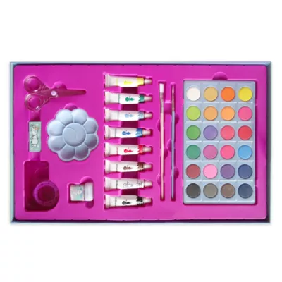 - Includes: 24 paints, 18 washable markers, 18 oil pastels, 16 crayons, 16 coloured pencils, 10 sheets, 8 water colour paints, , 2 HB pencils, 2 paint brushes, character stencil, A4 sketch pad, rubber, pencil sharpener, ruler, scissors and tape