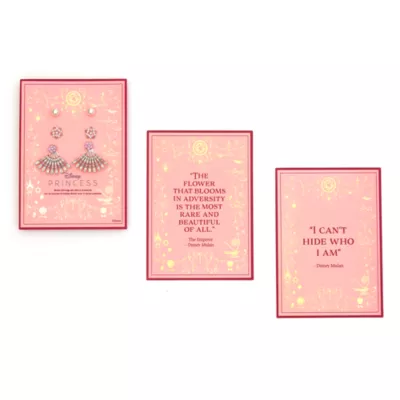 Bring honour to your outfit with this set of Mulan earrings. Featuring three pairs of beautiful earrings, including a flower fan pair, the sparkling set comes with two postcards.