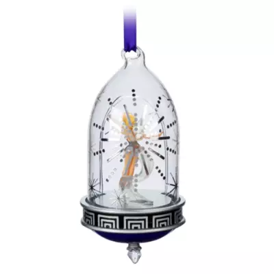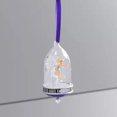 Dream of faraway fantasy worlds while gazing at our glittering glass Tinker Bell ornament. In her classic pose, a sculpted Tink figurine is placed within a pixie-dusted clear bell dome to peer from the picture window into your home decor.